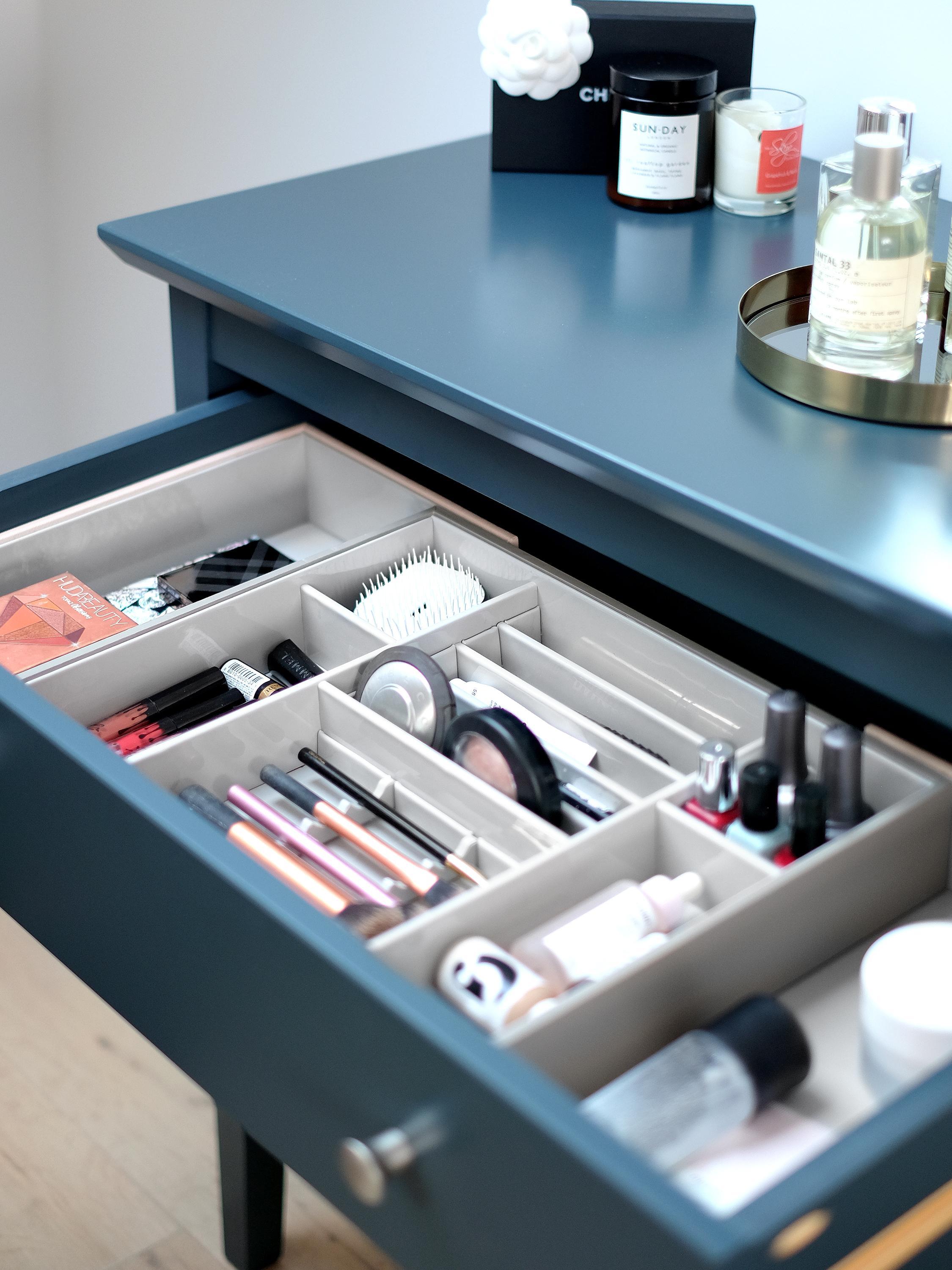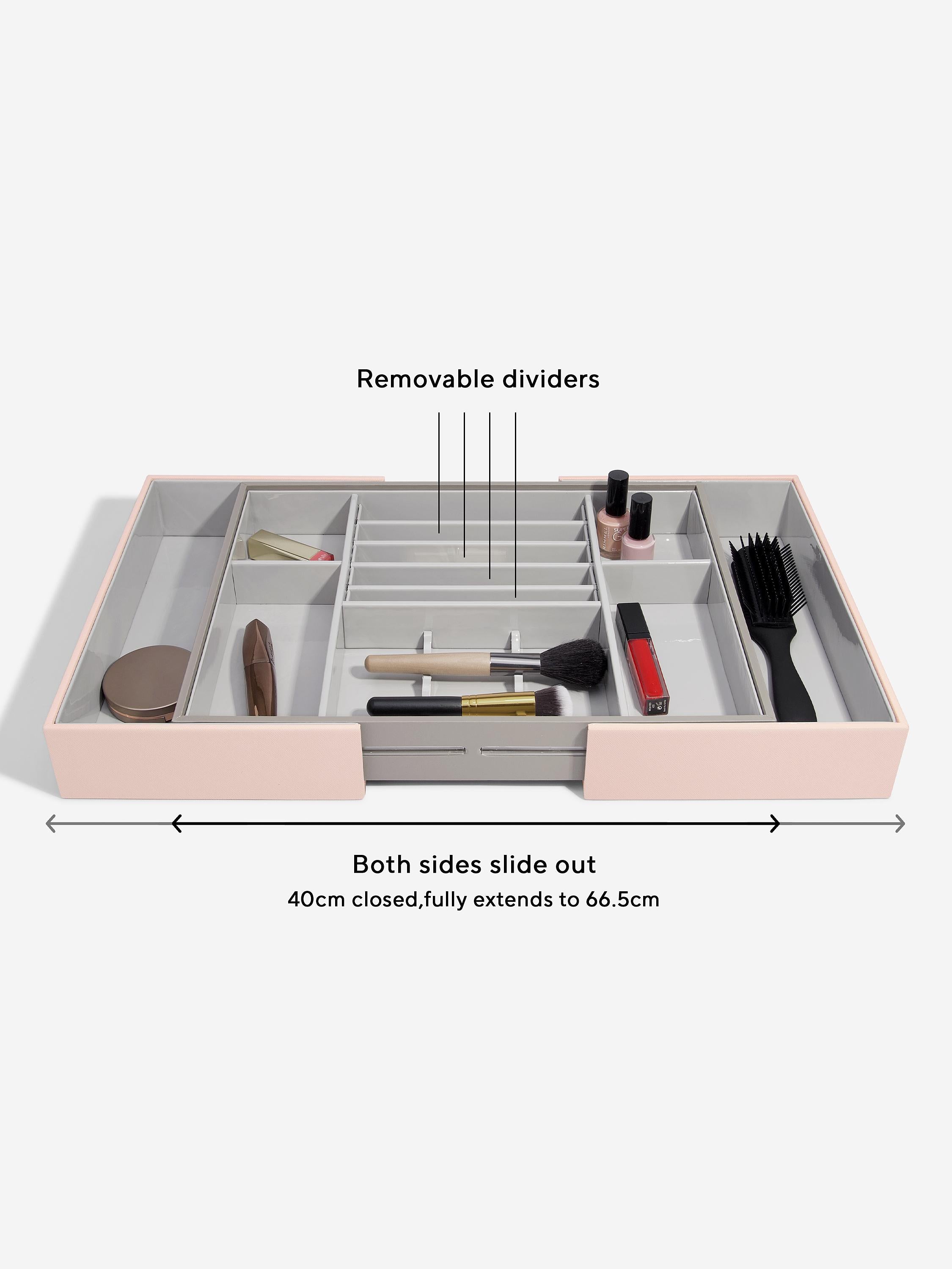 The Makeup In-Drawer Organiser is the perfect solution to your makeup needs, featuring a wipeable lining and multiple compartments for every type of makeup. Some of the smaller compartments can be made larger by removing the dividers. For the larger makeup collections, the drawers also expands so can fit a wide range of drawer sizes.Â